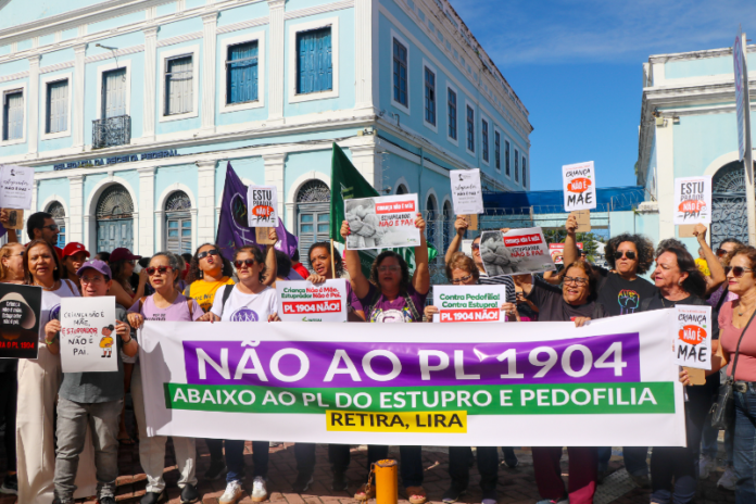 Centenas de mulheres participaram, na manhã desta terça-feira (18), em Maceió, do ato público contra o Projeto de Lei (PL) 1.904/24, que equipara o aborto realizado após 22 semanas de gestação ao crime de homicídio simples, inclusive nos casos em que o procedimento é permitido por lei, como gravidez resultante de abuso sexual.