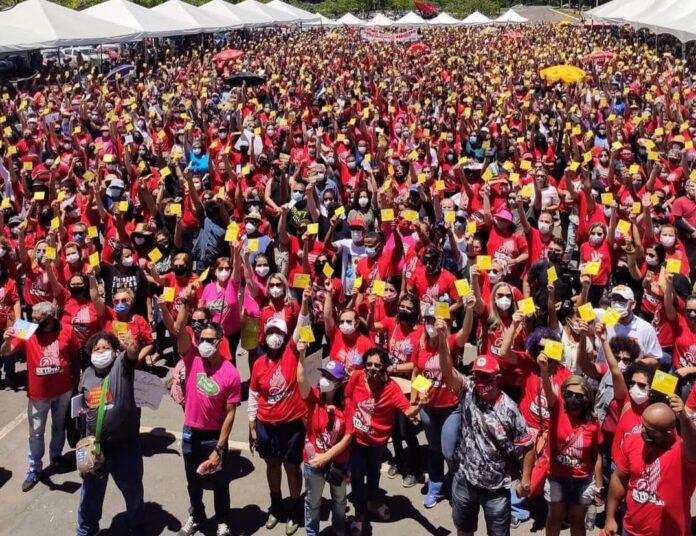 Depois de 2 anos debatendo sob a mediação das telas e monitores, professores(as) e orientadores(as) educacionais do Distrito Federal se encontraram presencialmente na manhã desta terça-feira, 22, em assembleia geral realizada no estacionamento da Funarte. Inicialmente prevista para a Praça do Buriti, a assembleia teve de mudar de local por conta da não autorização do GDF da presença de um carro de som na praça em frente à sede do governo.