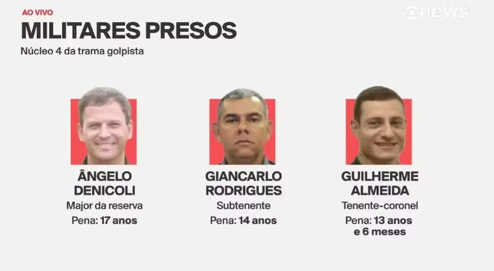 O Exército prendeu três militares condenados no núcleo 4 na trama golpista nesta sexta-feira (10), após ordem do ministro Alexandre de Moraes, do Supremo Tribunal Federal (STF). O grupo reúne sete réus acusados de disseminar notícias falsas para criar instabilidade institucional. Dois condenados seguem foragidos no exterior.